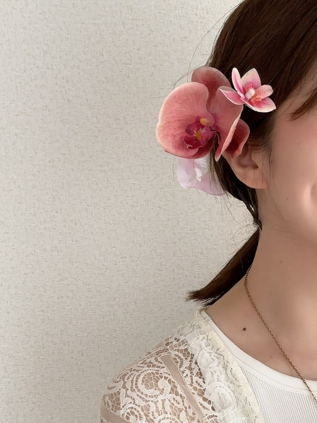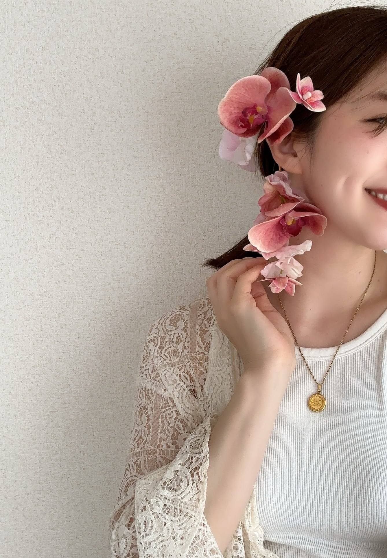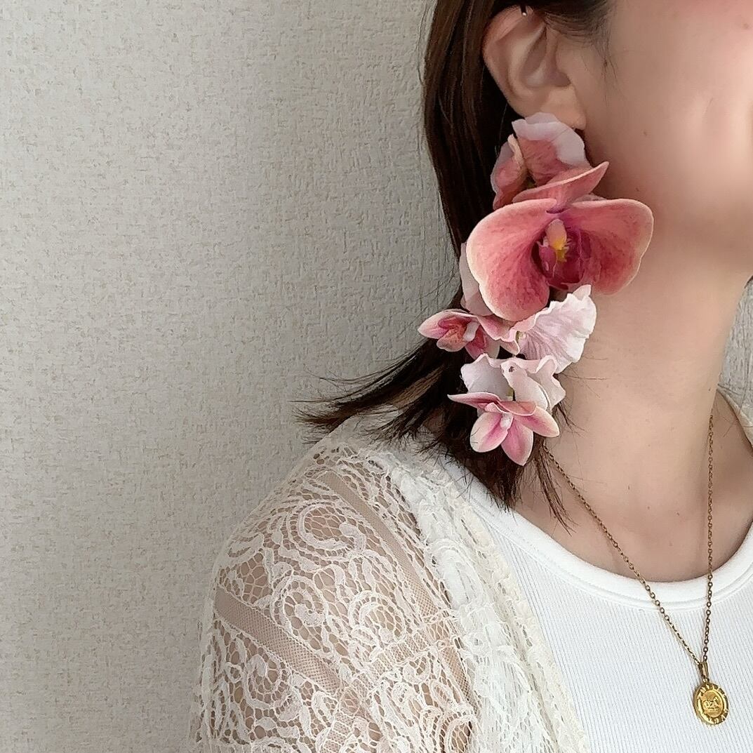 左耳イヤーカフ、その上に小花を2パーツほど付け、