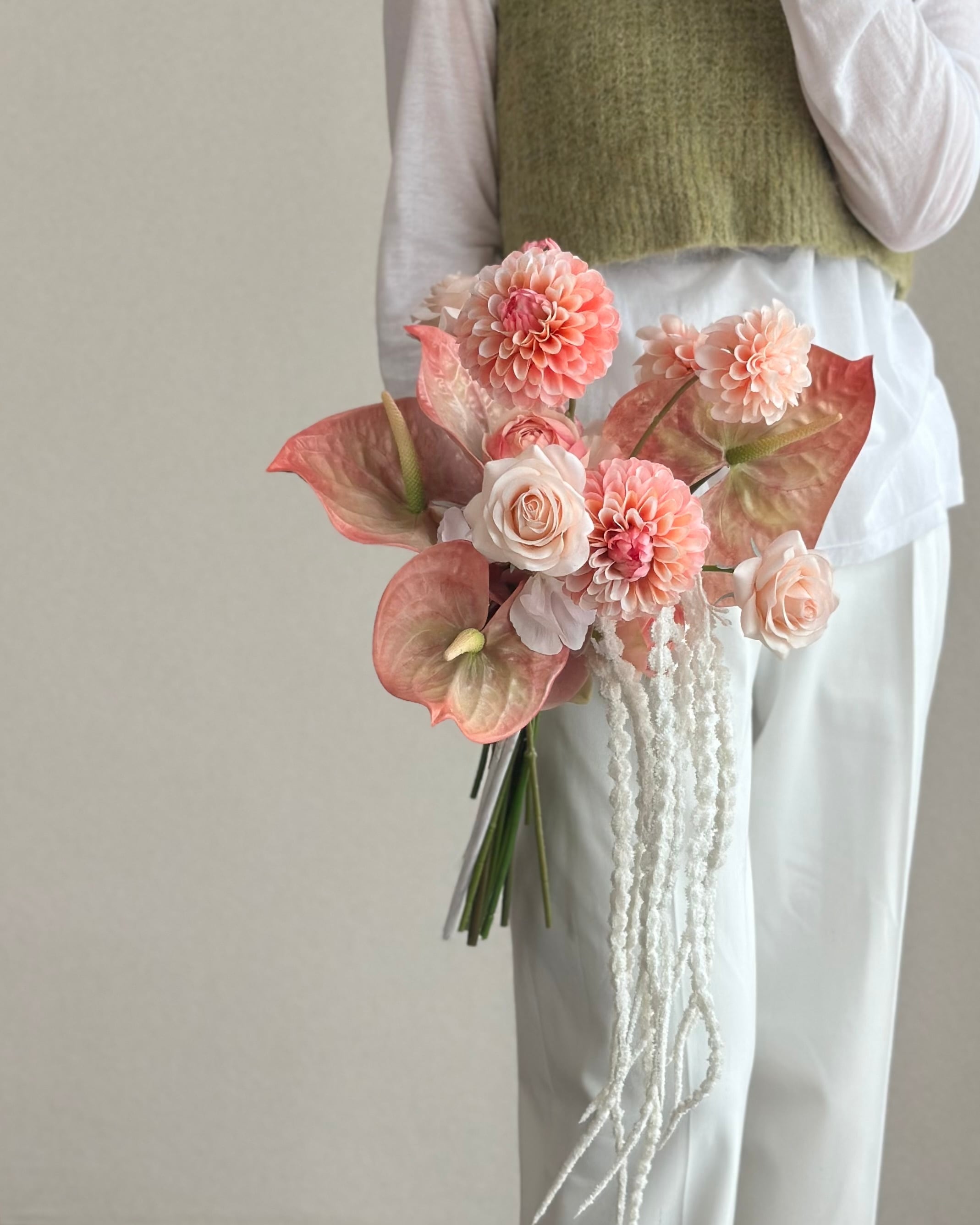 大ぶりのアンスリウムやダリア、アマランサスなど人気のお花が入ったシャワーブーケです。