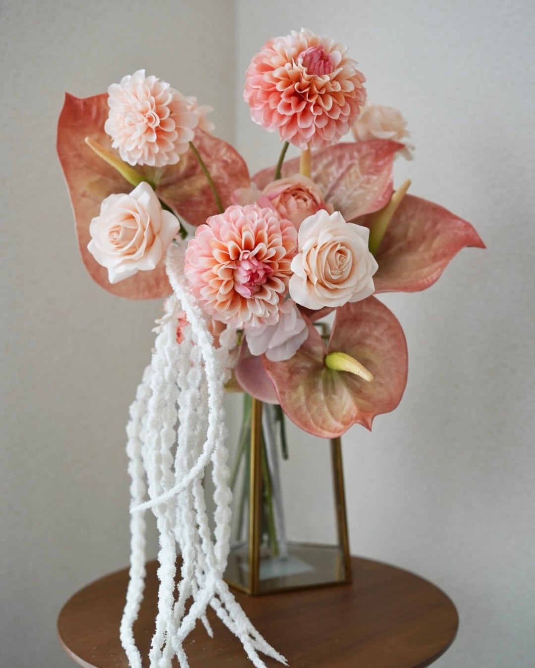 耐久性と芸術性の高いアーティフィシャルフラワーを使っておりますので、前撮り、挙式、ハネムーン後撮り、ウェディング後はインテリアとしてお部屋に飾って頂くことも可能です。